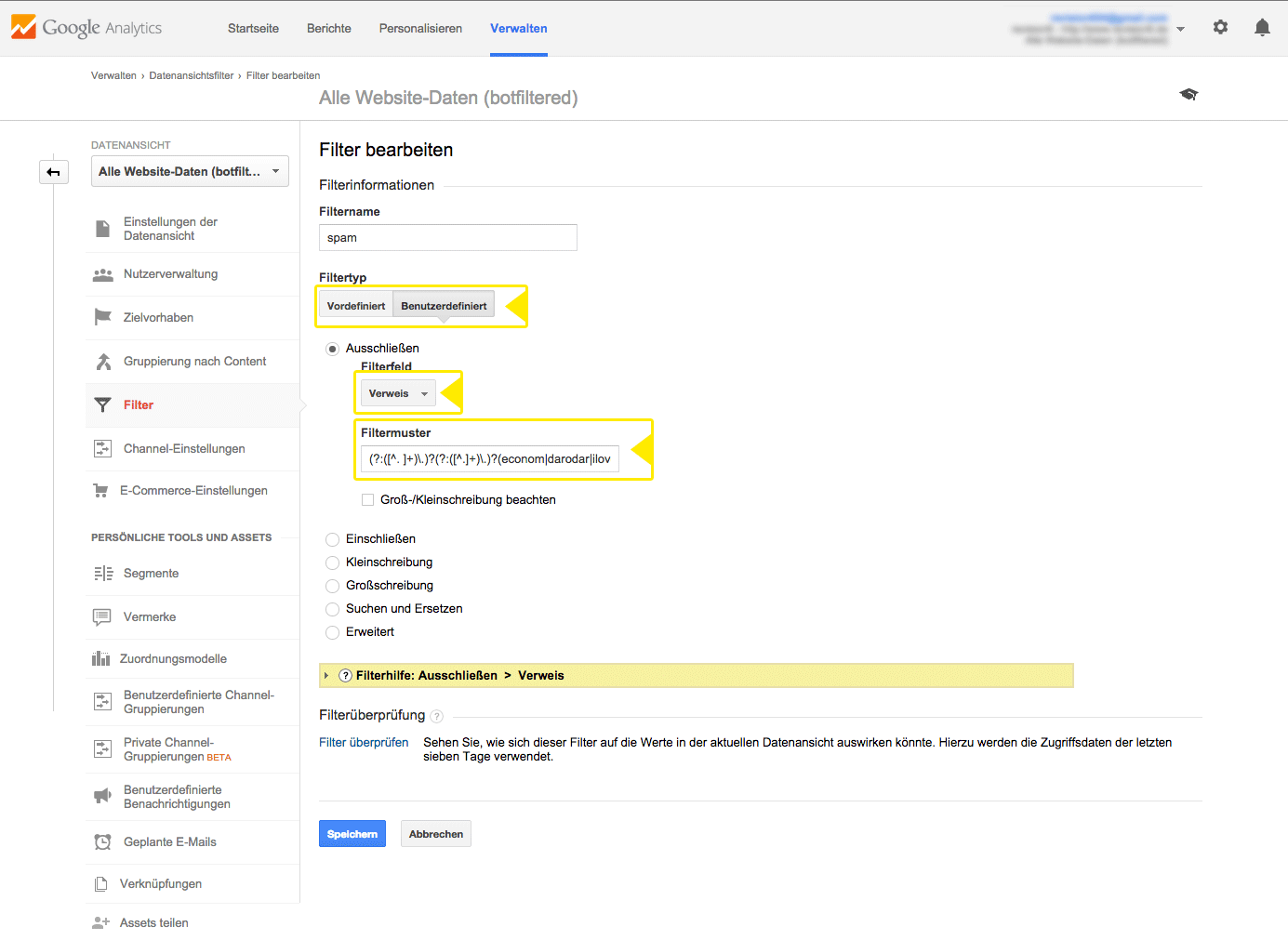 Diesem Filter habe ich jetzt die Bezeichnung "spam" gegeben, aber das ist nicht ausschlaggebend ;-). Als Filtertyp muss "Benutzerdefinierend" ausgewählt und anschließend der Radio-Button "Ausschließen" aktiviert werden mit dem Filterfeld "Verweis". Dort kommt jetzt eine Zeile Regex rein.