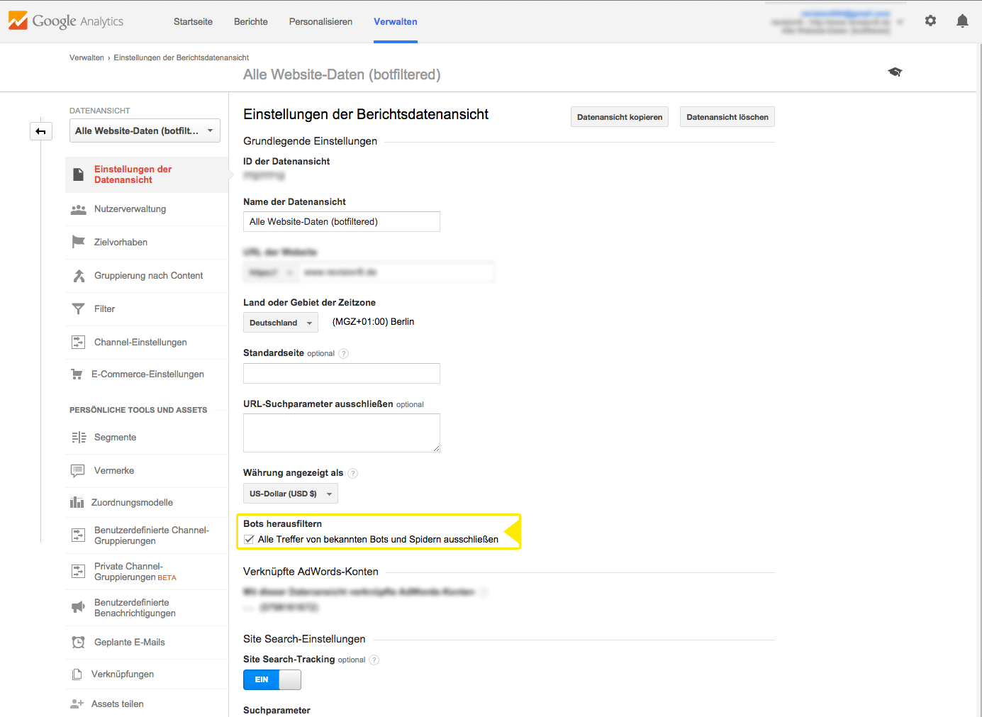 Im ersten Schritt in Google Analytics einloggen, die Statistik der betroffenen Seite aufrufen und oben auf Verwalten klicken. Dort unter Datenansicht den Punkt "Einstellungen der Datenansicht" anklicken.